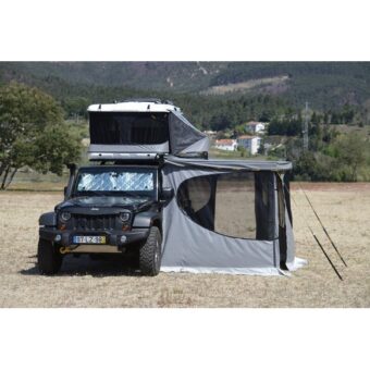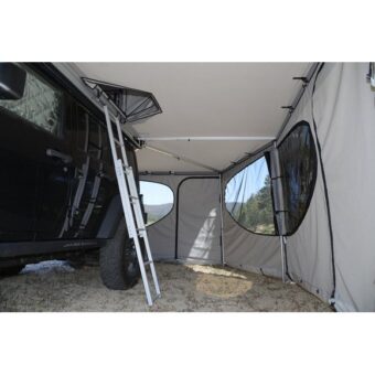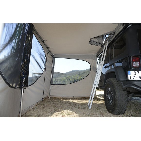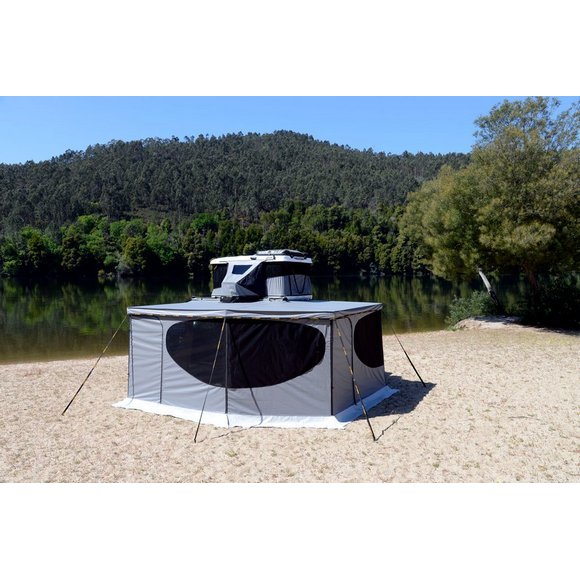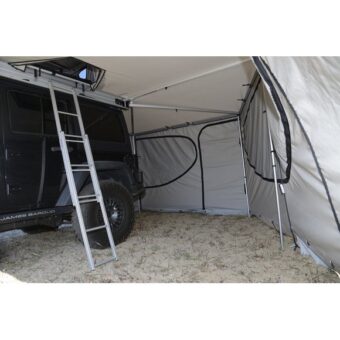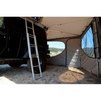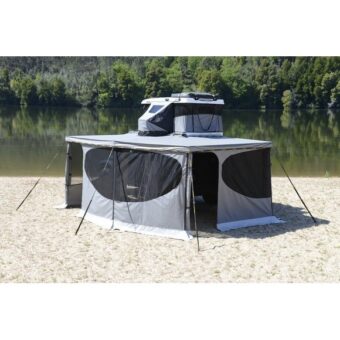 Parois latérales pour store Falcon 270° James Baroud.Ces parois ferment l’ensemble de l’abris et créent ainsi une pièce de vie complètement abritée des intempéries, ou des regards extérieurs. …