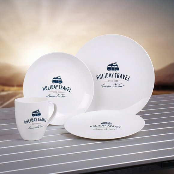 Kit vaisselle 2 personnes HOLIDAY TRAVEL SERIES • Convient au micro-ondes • Lavable au lave-vaisselle à basse température • Fabriqué à partir de matières premières renouvelables, le PLA Le PLA est un plastique fabriqué à partir de matières premières renouvelables telles que la betterave sucrière, le sucre de canne, le blé et le maïs. Il est biodégradable et sans BPA. Set pour 2 personnes composé de 8 pièces : * 2 assiettes plates Ø25.4cm * 2assiettes à dessert Ø 21.5 cm * 2 assiettes creuses Ø21 cm * 2 Mug Ø 8,5 cm, H 10cm, 350ml