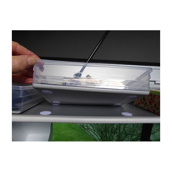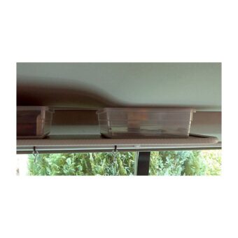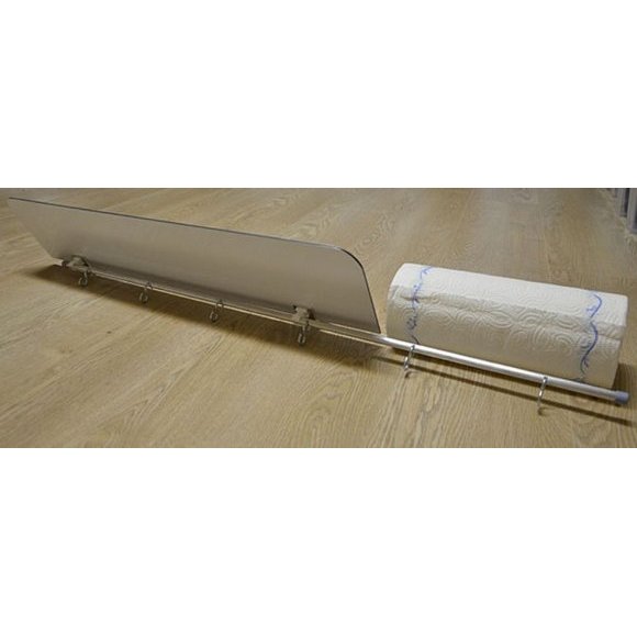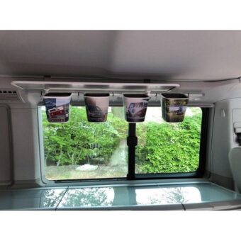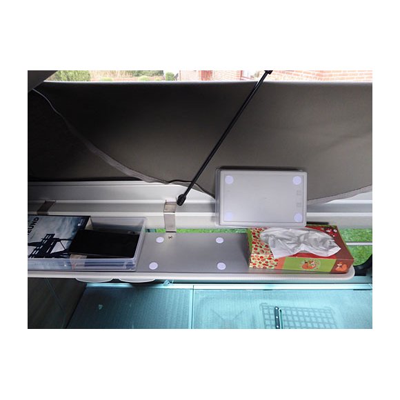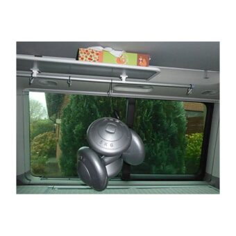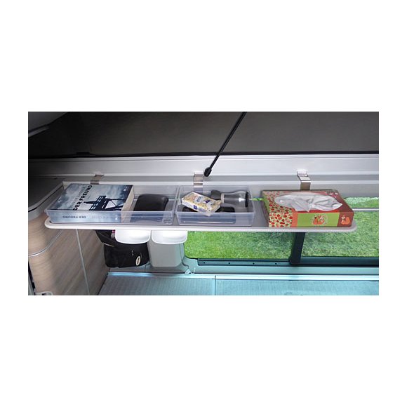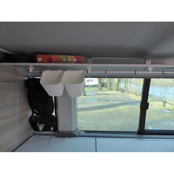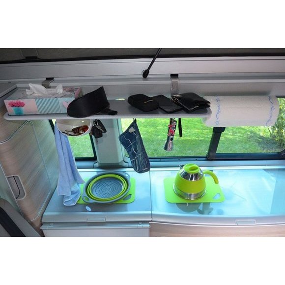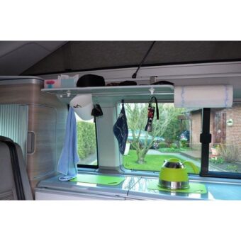Etagère pour la cuisine du California avec tige porte-manteau. Fixation sans perçage. Cette étagère de cuisine peut rester installée pendant la conduite. Aucun perçage ni collage ne sont nécessaire. La tige porte manteau supporte jusqu’à 10 Kg! Les crochets peuvent être retirés, pour fixer des boites de rangements (non fournies) par exemple. Sur l’étagère, vous pouvez prévoir également de fixer des boites de rangement (non fournies) grâce à des pastilles de velcro, afin de les fixer lors des déplacements. Etagères livrées à assembler, temps de montage : 3 minutes, à l’aide d’un tournevis cruciforme uniquement. Compatibilité : Volkswagen T6.1 , T6 et T5 California Confort, Beach, Ocean, Coast. Tablette (panneau composite) : – Panneau composite en aluminium – Bordure en PVC antidérapant – Couleur : Blanc Tige porte manteau (aluminium anodisé): – Longueur : 90 cm – Six crochets en acier de suspension
