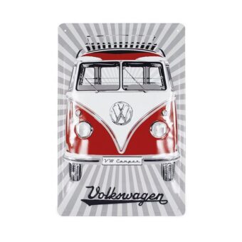 Plaque émaillée VW Combi T1 rouge pour les amoureux et collectionneur Volkswagen. Détail de l’article Plaque émaillée bombée et percée aux 4 coins. Fabrication Allemande En métal émaillé de haute qualité Visuel : Combi Volkswagen T1 Rouge. Vendu sous la licence officielle : Volkswagen