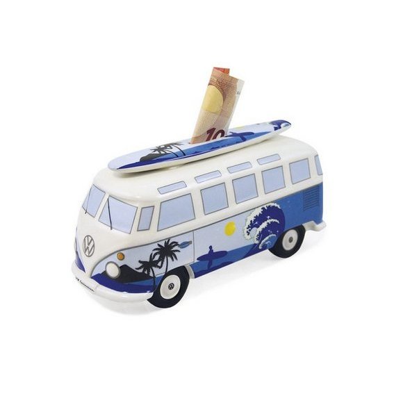 Tirelire VW Combi T1 en céramique Plage et vague bleue • Matière : Céramique. • Couleur : Samba avec planche de surf. • Livrée dans une boîte-cadeau. • Poids : 0,93 kg.