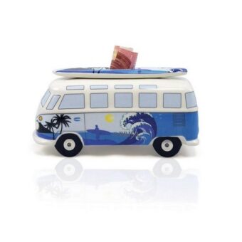 Tirelire VW Combi T1 en céramique Plage et vague bleue • Matière : Céramique. • Couleur : Samba avec planche de surf. • Livrée dans une boîte-cadeau. • Poids : 0,93 kg. …