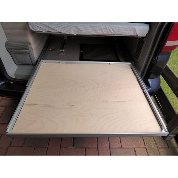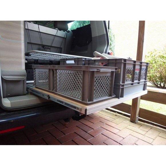 Le tiroir coulissant pour le coffre du Volkswagen California. Rangement optimal pour ne plus avoir à se pencher dans le coffre. Se fixant uniquement sur les rails du California, aucun perçage n’est nécessaire ! Tiroir parfaitement adapté aux Eurobox, ainsi qu’à tout autre type de rangement. Compatibilité : California T6 / T6.1 Ocean et Coast et California T5 Confortline Propriétés : – Poids : 7 kg (sans plaque de fond) – Résistance : Jusqu’à 120 kg – Dimensions intérieures du tiroir : 80 x 91 cm Le kit contient : – Notice en français – Armature – Visserie – Planche de fond bois avec revêtement anti-dérapant.
